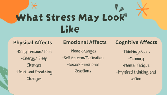 The presentation consisted of slides describing how stress affects the body-the physical, emotional, and mental aspects. It was clarified that finding ways to cope with stressful times is important to build relationships and handle future events. A video was shown to demonstrate how stress looks, and display healthy coping mechanisms to use as a way to surpass it. When talking to one of the coordinators, Mrs. Alma, she shared her hopes for students to learn new skills that bring self-awareness to their stress levels. With this, it is important to note that there are unhealthy coping mechanisms, but there are much healthier substitutes. As for future times that concern stress management and mental health awareness, the Wellness Center plans to hold other events or booths to promote such awareness of feelings, especially while approaching finals. (Picture of a slide that lists people to go to on campus. Description: No one should have to feel alone!)